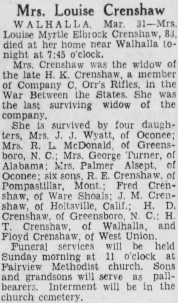 Transcription: "Mrs. Louise Crenshaw: Wallhalla, March 31 - Mrs. Louise Myrtle Elbrook Crenshaw, 83, died at her home near Walhalla tonight at 7:45 o'clock.