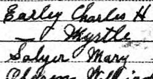 In 1930, Myrtle, aged 26, lived with her husband, Charles H. Earley, 43, and a roomer, Mary Salyer, 39. They rented an apartment at 300 West Watauga Avenue, Johnson City, Tennessee, for $35 per month. Everyone in the household was married, although Mary’s husband was not present. Charles and Myrtle married when Charles was 43 and Myrtle was 25. Charles and his parents were born in Indiana, while Myrtle’s birthplace was mistakenly listed as Alabama, though she and her parents were from South Carolina. Mary and her parents were born in Georgia. Everyone in the household could read and write English. Charles was a machinery salesman and was not a veteran. Name listed: Myrtle Earley7