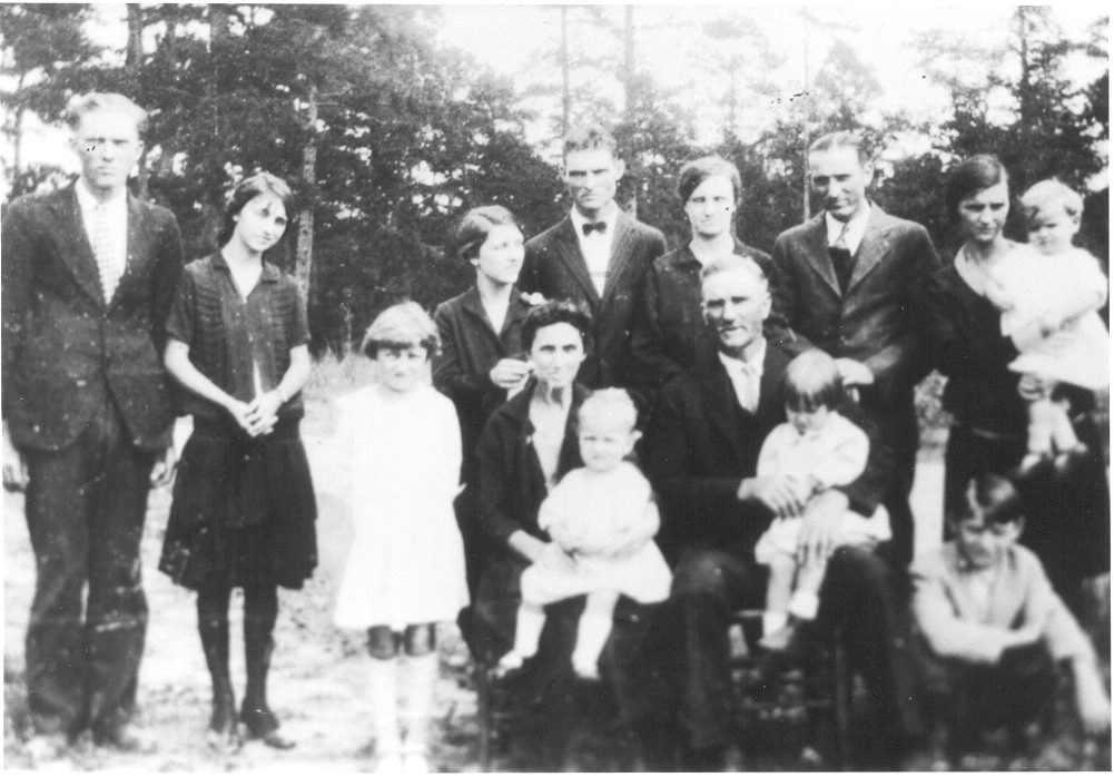 Myrtle with family. Myrtle is likely the woman standing behind her mother, Ava Laurena Crenshaw, who has a small child on her lap. Sitting next to Ava is Myrtle’s father, Robert Earl Lee McDonald, holding another small child.