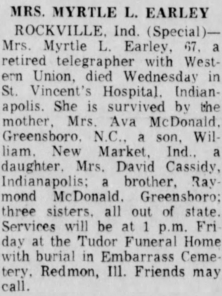 Myrtle died at 6:45am on October 17, 1973, at the St. Vincent Hospital in Indianapolis, Indiana.16 She was 67 years old, born in South Carolina, and she was a widow. Her last address was 809 Buena Vista Street, Rockville, Indiana, and she was a retired telegrapher for Western Union. Her cause of death was strangulation of the small intestines with thrombosis mesenteric arteries, for which she had suffered for seven days, and an autopsy was performed. Her parents were Robert McDonald and Ava Crenshaw, and her son, William Earley of New Market, Indiana, was the informant for her death certificate. She was buried at Embarrass Cemetery in Redmon, Illinois, next to her husband.17