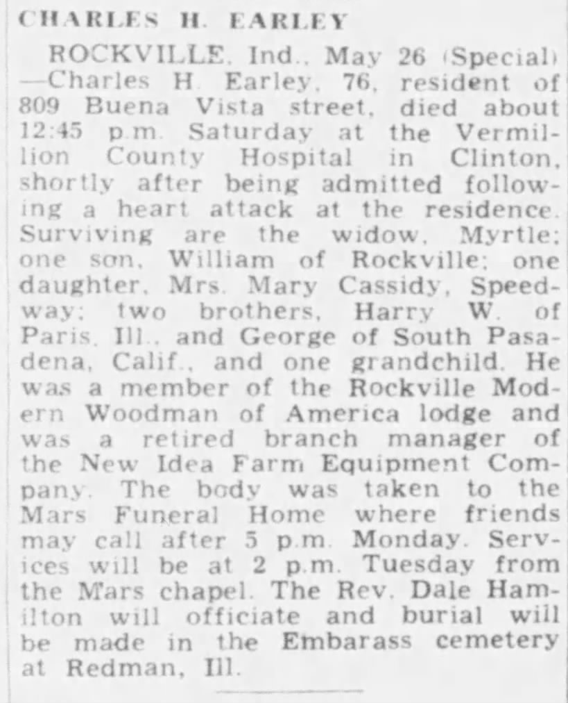 14. “Deaths: Charles H. Earley,” The Terre Haute Tribune, 27 May 1962, p. 8, col. 3, image, Newspapers.com (https://www.newspapers.com/article/the-terre-haute-tribune-obituary-for-cha/148158037/ : accessed 27 May 2024), clip page by user genistory. ↩︎