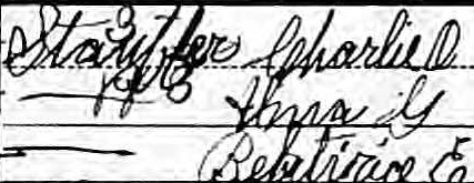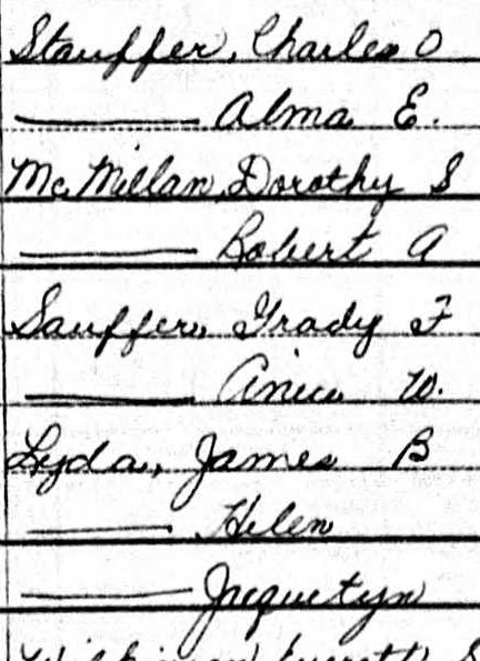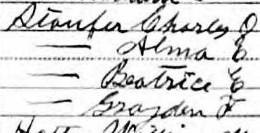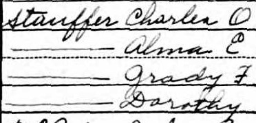 In 1910, Alma E., 29, and Charles O. Stauffer (misspelled Staufer), 33, lived with their children Beatrice E., 11, and Grayden F., 4, in a rented house in Buchanan, Virginia. Alma and Charles had been married for 12 years and had two children. Charles was a laborer at a sawmill, and both children had attended school. Everybody in the household was native to Pennsylvania, and they could read, write, and speak English. Name listed: Alma E Staufer4