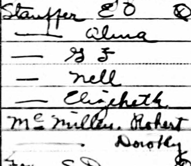 In 1940, Alma (59) and C.O. (Charles) Stauffer lived at 62 Woodward Avenue, Asheville, North Carolina, with their son G.F. (Grady) Stauffer (39), his wife Nell (32), their granddaughter Elizabeth (1), and their daughter Dorothy McMillen (22) and her husband Robert. The family paid $32 per month in rent. Charles, Alma, and Grady were born in Pennsylvania; Nell, Elizabeth, and Robert were born in North Carolina; and Dorothy was born in Virginia.