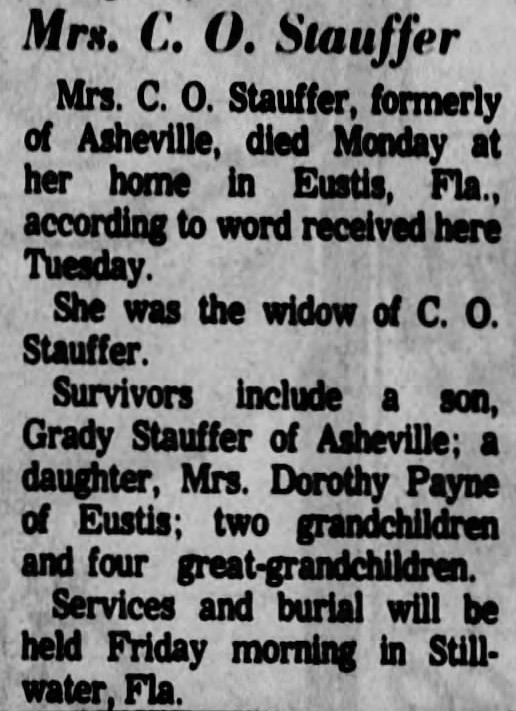 "Survivors include a son, Grady Stauffer of Asheville; a daughter, Mrs. Dorothy Payne of Eustis; two grandchildren, and four great-grandchildren.