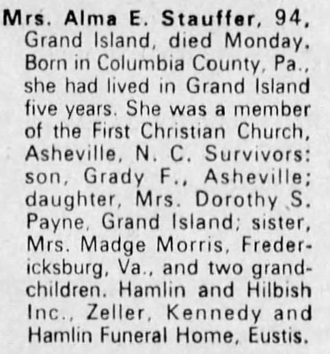 "Mrs. Alma E. Stauffer, 94, Grand Island, died Monday. Born in Columbia County, Pa., She had lived in Grand Island for five years. She was a member of the First Christian Church, Asheville, N.C. Survivors: son, Grady F., Asheville; daughter, Mrs. Dorothy S Payne, Grand Island; sister, Mrs. Madge Morris, Fredericksburg, Va.; and two grandchildren. Hamlin and Hilbish Inc., Zeller, Kennedy, and Hamlin Funeral Home, Eustis."