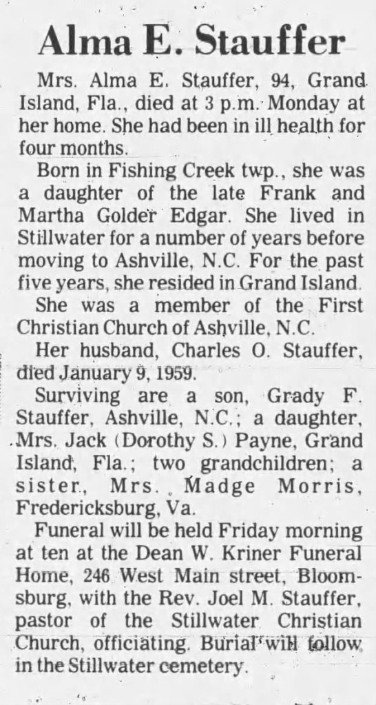 - “Deaths-Mrs. C.O. Stauffer,” Asheville Citizen-Times, Asheville, NC, 24 September 1975, p. 13, col. 5, image, Newspapers.com (https://www.newspapers.com/article/asheville-citizen-times/27015452/ : accessed 9 January 2019), clip page by user genistory; “Deaths-Alma E. Stauffer,” The Morning Press, Bloomsburg, PA, 23 September 1975, p. 2, col. 3, image, Newspapers.com (https://www.newspapers.com/article/the-morning-press-obituary-for-alma-e-st/148406057/ : accessed 30 May 2024), clip page by user genistory; “Obituaries: Mrs. Alma E. Stauffer,” The Orlando Sentinel, Orlando, FL, 24 September 1975, p. 6C, col. 2, image, Newspapers.com (https://www.newspapers.com/article/the-orlando-sentinel-obituary-for-alma-e/75170348/ : accessed 5 April 2021), clip page by user genistory. ↩︎