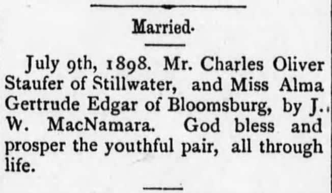 - “Married,” The Columbian, Bloomsburg, PA, 14 July 1898, p. 5, col. 3, image, Newspapers.com (https://www.newspapers.com/article/the-columbian/148379526/ : accessed 30 May 2024), clip page by user genistory; “Pennsylvania, Marriages, 1852-1968,” image, Ancestry (https://www.ancestry.com : accessed 8 April 2021), marriage license for Charles Oliver Staufer and Miss Alma Gertrude Edgar; State of Pennsylvania, County of Columbia, lic. no. 3794, 9 July 1898. ↩︎