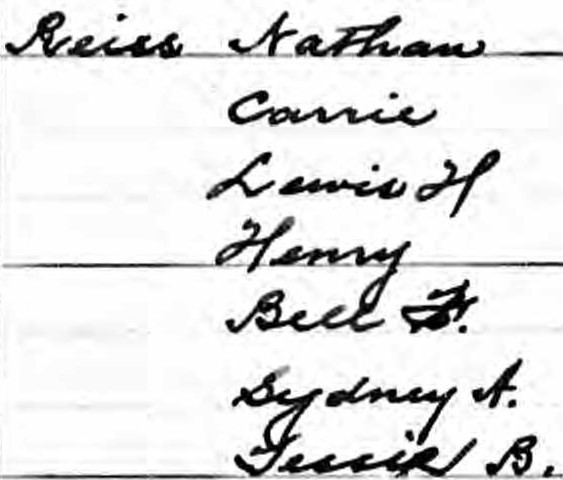 - 1910 U.S. Census, Essex County, New Jersey, population schedule, Newark, ward 11, enumeration district (ED) 97, p. 217 (stamped), 90A (inked), dwelling 161, family 213, Nathan Reiss, image, Ancestry (http://www.ancestry.com : accessed 27 February 2021), citing NARA microfilm publication T624, microfilm 954, roll 880. ↩︎