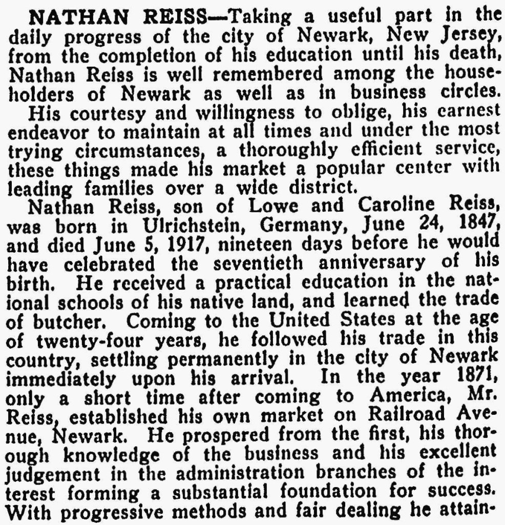 Nathan Reiss, son of Lowe and Caroline Reiss, was born in Ulrichstein, Germany, June 24, 1847, and died June 5, 1917, nineteen days before he would have celebrated the seventieth anniversary of his birth. He received a practical education in the national schools of his native land, and learned the trade of butcher. Coming to the United States at the age of twenty-four years, he followed his trade in this country, settling permanently in the city of Newark immediately upon his arrival. In the year 1871, only a short time after coming to America, Mr. Reiss, established his own market on Railroad Avenue, Newark. He prospered from the first, his thorough knowledge of the business and his excellent judgement in the administration branches of the interest forming a substatantial foundation for success. With progressive methods and fair dealing he attained an enviable position in his chosen field of endeavor. Later securing