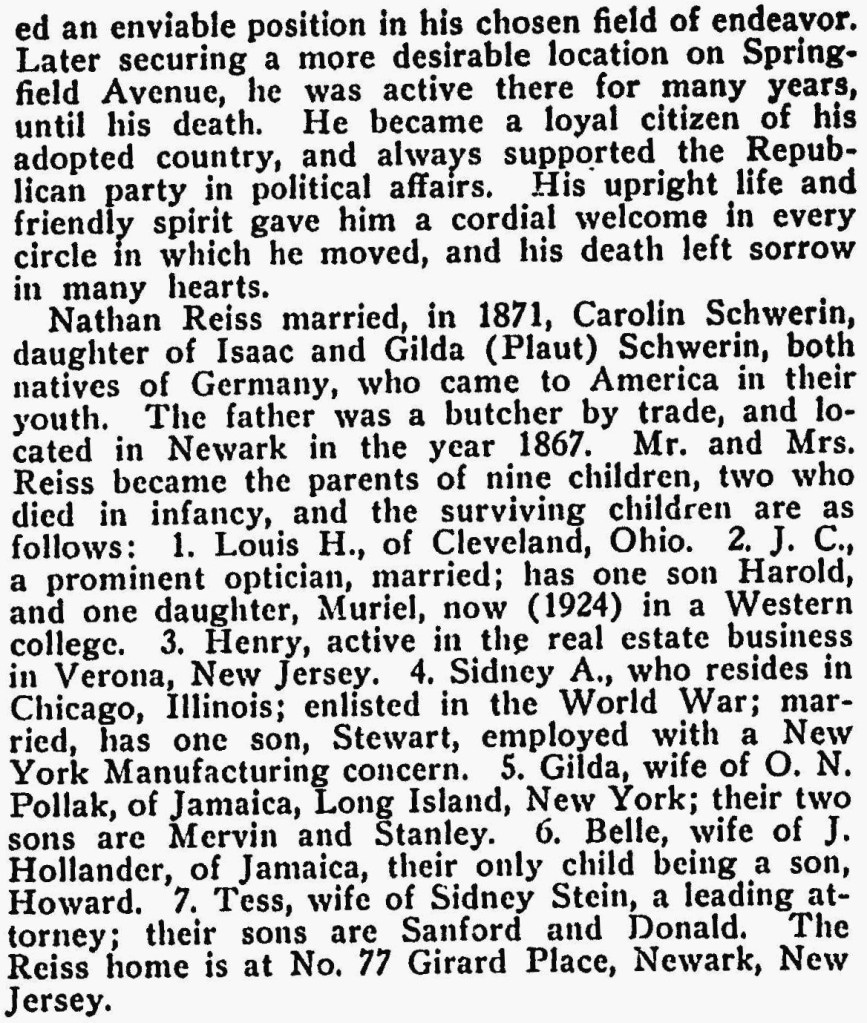 Nathan Reiss married, in 1871, Carolin Schwerin, daughter of Isaac and Gilda (Plaut) Schwerin, both natives of Germany, who came to America in their youth. The father was a butcher by trade, and located in Newark in the year 1867. Mr. and Mrs. Reiss became the parents of nine children, two who died in infancy, and the surviving children are as follows: 1. Louis H., of Cleveland, Ohio. 2. J.C., a prominent optician, married; has one son, Harold, and one daughter, Murial, now (1924) in a Western college. 3. Henry, active in the real estate business in Verona, New Jersey. 4. Sidney A., who resides in Chicago, Illinois; enlisted in the World War; married, has one son, Stewart, employed with a New York Manufacturing concern. 5. Gilda, wife of O.N. Pollak, of Jamaica, Long Island, New York; their two sons are Mervin and Stanley. 6. Belle, wife of J. Hollander, of Jamaica, their only son, Howard. 7. Tess, wife of Sidney Stein, a leading attorney; their sons are Sanford and Donald. The Reiss home is at No. 77 Girard Place, Newark, New Jersey.