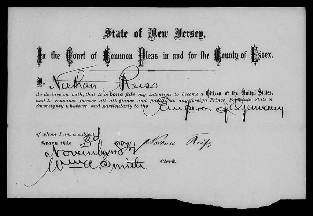 Nathan became a naturalized citizen of the United States in New Jersey on November 3, 1882. He signed his name “Nathan Reißs.”12