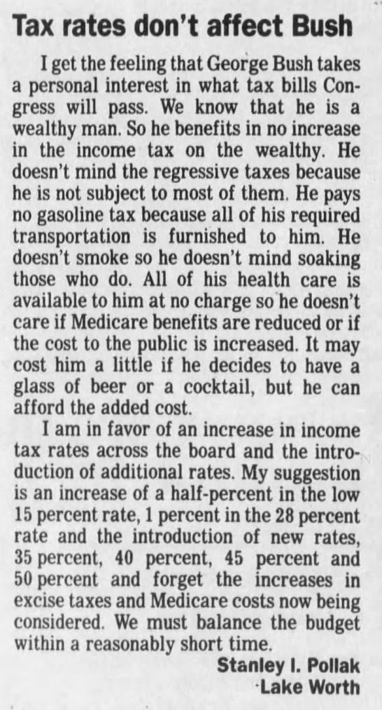- Stanley I. Pollak, “Letters To The Editor: Tax rates don’t affect Bush,” The Palm Beach Post, West Palm Beach, FL, 20 October 1990, p. 2E. cols. 2-3, image, Newspapers.com (https://www.newspapers.com/article/the-palm-beach-post/58029088/ : accessed 25 August 2020), clip page by user genistory. ↩︎