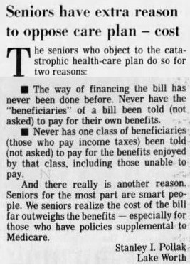- Stanley I. Pollak, “Letters To The Editor: Seniors have extra reason to oppose care plan – cost,” The Palm Beach Post, West Palm Beach, FL, 11 October 1989, p. 2E. cols. 4-5, image, Newspapers.com (https://www.newspapers.com/article/the-palm-beach-post/58028772/ : accessed 25 August 2020), clip page by user genistory. ↩︎