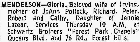 "MENDELSON-Gloria, Beloved wife of Irving, mother of JoAnn Pollack, Richard, Peter, Robert and Cathy. Daughter of Jennie Lazear. Services Thursday 10 A.M. at Schwartz Brothers, "Forest Park Chapels" Queens Blvd. and 76 Rd., Forest Hills."