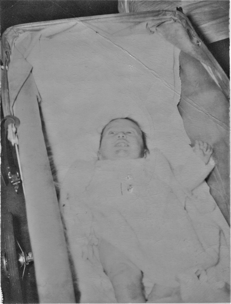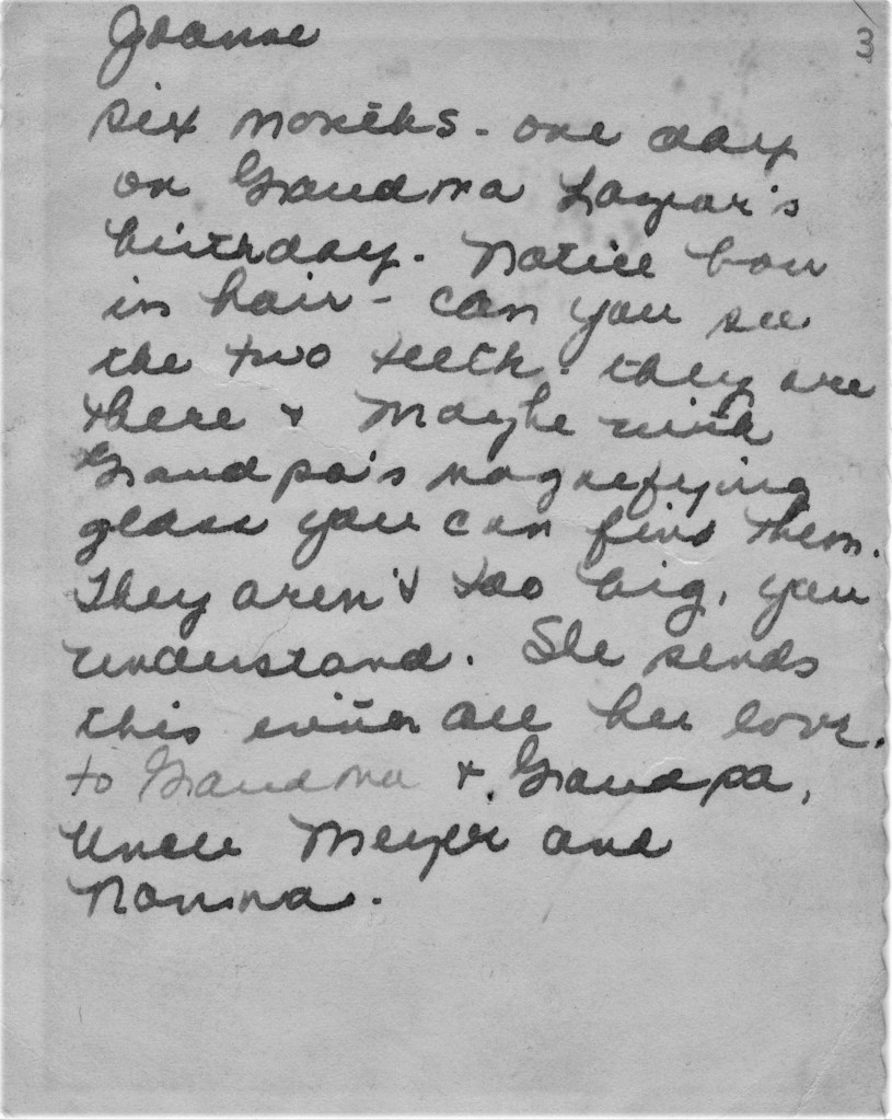 Pictures of Gloria’s daughter, JoAnne, were sent to Jennie when JoAnne was an infant. On the back of one picture, Gloria wrote, “Joanne, six months – one day on Grandma Lazear’s birthday. Notice bow in hair – can you see the two teeth, they are there & maybe with Grandpa’s magnifying glass you can find them. They aren’t too big, you understand. She sends this with all her love, to Grandpa & Grandma, Uncle Meyer and Nanna.”