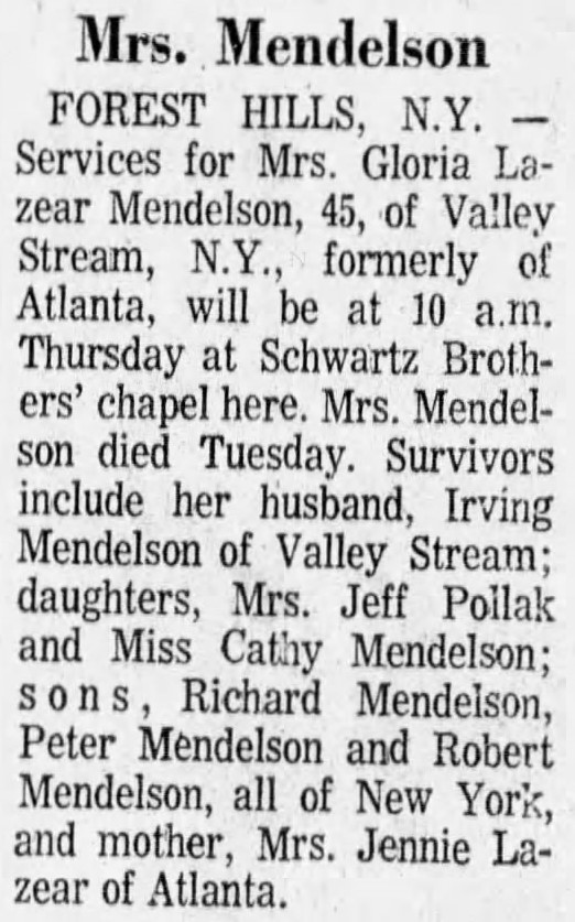"Mrs. Mendelson: FOREST HILLS, N.Y. - Services for Mrs. Gloria Lazear Mendelson, 45, of Valley Stream, N.Y., formerly of Atlanta, will be at 10 a.m. Thursday at Schwartz Brothers' chapel here. Mrs. Mendelson died Tuesday. Survivors include her husband, Irving Mendelson of Valley Stream; daughters, Mrs. Jeff Pollak and Miss Cathy Mendelson; sons, Richard Mendelson, Peter Mendelson and Robert Mendelson, all of New York, and mother, Mrs. Jennie Lazear of Atlanta."
