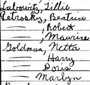 Tillie was born in Russia, Harry was born in New York, and everyone else was born in Pennsylvania. Tillie had no formal education, Harry and Doris had completed two years of high school, Netta had completed three years of high school, and Marlyn had completed sixth grade. Name listed: Tillie Labowitz9