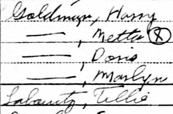In 1940, Tillie, 70, lived with her daughter Netta, 39; son-in-law Harry, 50; and granddaughters Doris, 15, and Marlyn Goldman, 11. They still owned their house at 5644 Pine Street, Philadelphia, Pennsylvania, but the value had dropped to $5,000 after the Depression. Harry worked as a wholesale dress salesman, working 50 hours a week, 52 weeks a year, and earning $2,000 annually.