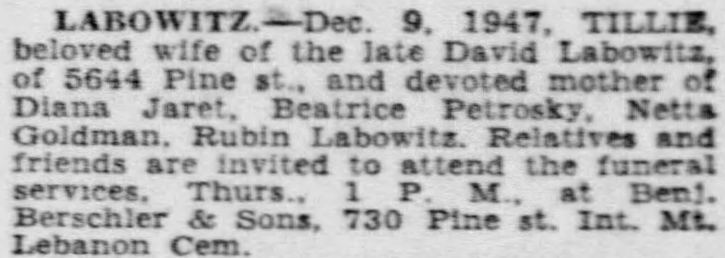 Transcript: "LABOWITZ-Dec. 9, 1947, TILLIE, beloved wife of the late David Labowitz, of 5644 Pine st., and devoted mother of Diana Jaret, Beatrice Petrosky, Netta Goldman, Rubin Labowitz. Relatives and friends are invited to attend the funeral services, Thurs., 1 P.M., at the Benj. Berschler & Sons, 730 Pine st. Int. Mt. Lebanon Cem."