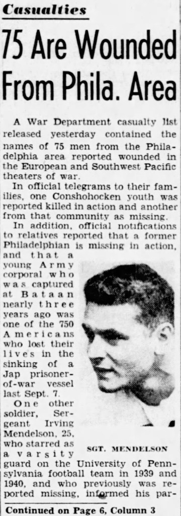 - “Mendelson May Start for Penn,” The Philadelphia Inquirer, Philadelphia, PA, 2 November 1938, p. 21, col. 5 & p. 23, cols. 6-7, image, Newspapers.com (https://www.newspapers.com/article/the-philadelphia-inquirer/15047877/ : accessed 11 November 2020), clip page by user genistory. ↩︎