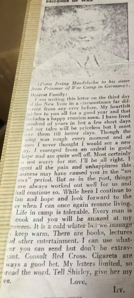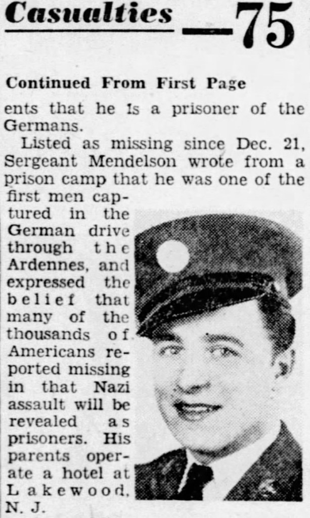 - “World War II Prisoners of War Data File (12/7/1941-11/19/1946)”, National Archives and Records Administration (https://aad.archives.gov/aad/record-detail.jsp?dt=3159&mtch=1&cat=GP24&tf=F&sc=11675%2C11660%2C11679%2C11667%2C11669%2C11676%2C11672%2C11673&bc=%2Csl%2Cfd&txt_11660=Irving%2BMendelson&op_11660=0&nfo_11660=V%2C24%2C1900&rpp=10&pg=1&rid=55424 : accessed 25 May 2024), entry for Irving Mendelson, ser. 32659209, 21 December 1944-23 July 1945. ↩︎