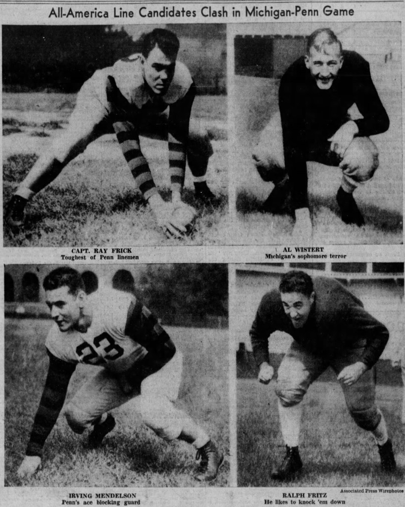- Detroit Free Press – October 24, 1940 “All-American Line Candidates Clash in Michigan-Penn Game”
