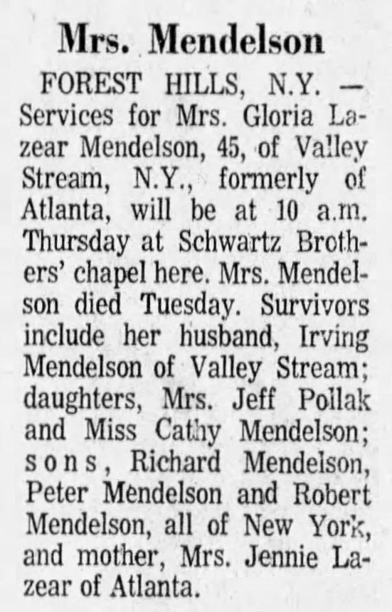 FOREST HILLS, N.Y.-Services for Mrs. Gloria Lazear Mendelson, 45, of Valley Stream, N.Y., formerly of Atlanta, will be at 10 a.m. Thursday at Schwartz Brothers' Chapel here. Mrs. Mendelson died Tuesday. Survivors include her husband, Irving Mendelson of Valley Stream; daughters, Mrs. Jeff Pollak and Miss Cathy Mendelson; sons, Richard Mendelson, Peter Mendelson and Robert Mendelson, all of New York, and mother, Mrs. Jennie Lazear of Atlanta.