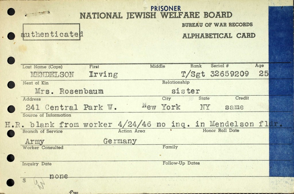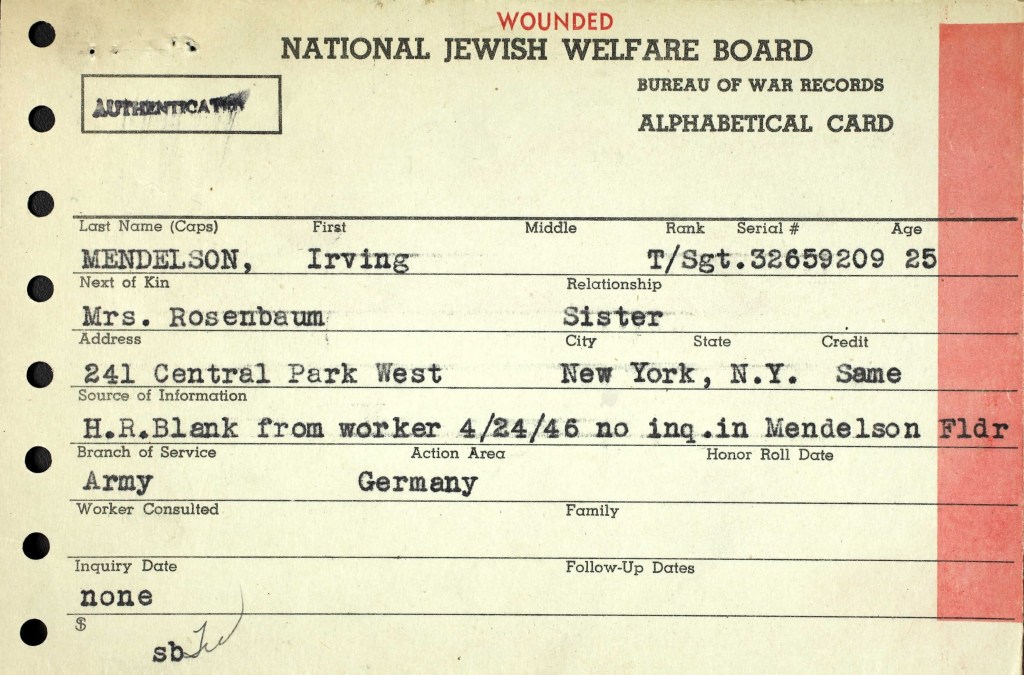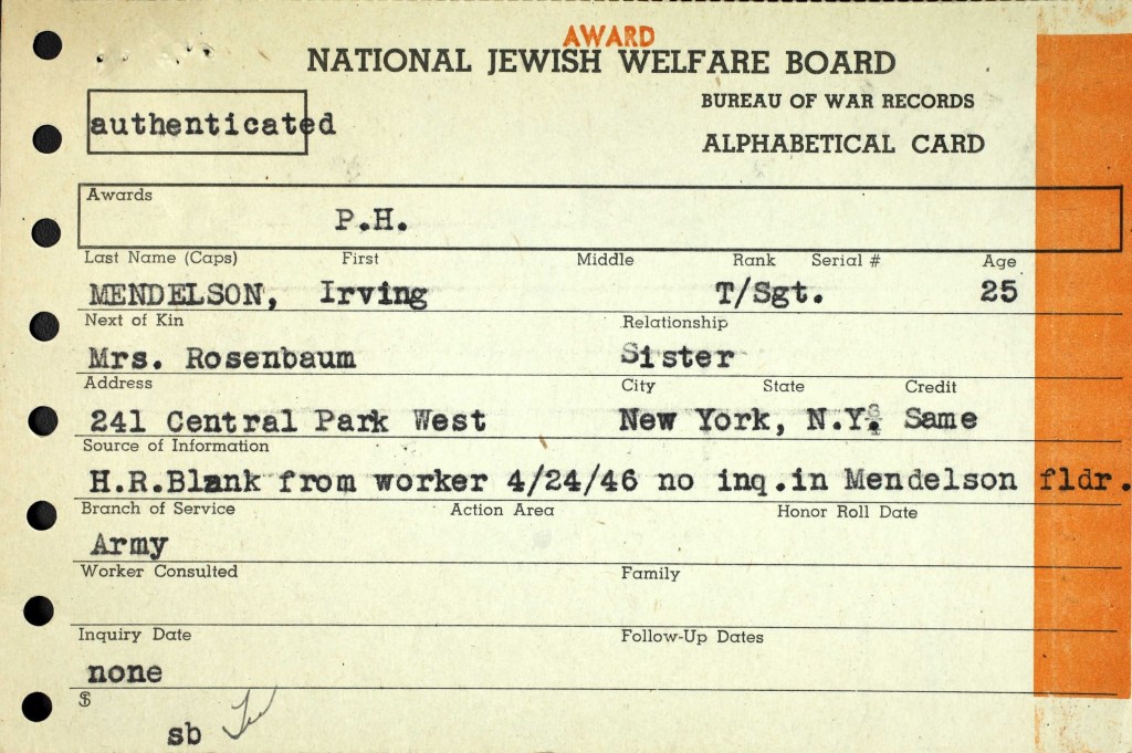 - “U.S., World War II Jewish Servicemen Cards, 1942-1947” images, Ancestry (https://www.ancestry.com : accessed 19 January 2021), entries for Irving Mendelson: Prisoner, Wounded, Award. ↩︎