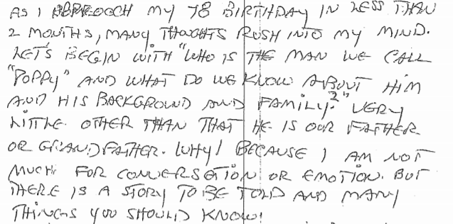 Transcript: “As I approach my 78 birthday in less than 2 months, many thoughts rush into my mind. Let’s begin with ‘Who is the man we call “Poppy” and what do we know about him and his background and family?’ Very little, other than that he is our father or grandfather. Why? Because I am not much for conversation or emotion. But there is a story to be told and many things you should know!“