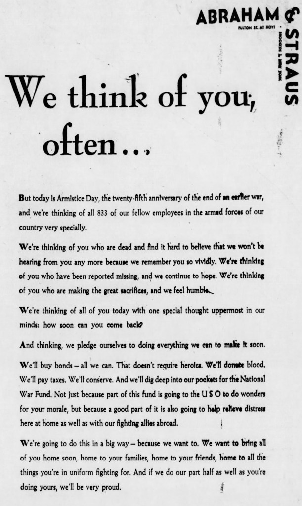 - “Advertisement: Abraham & Strauss,” The Brooklyn Daily Eagle, Brooklyn, NY, 11 November 1943, p. 20, image, Newspapers.com (https://www.newspapers.com/article/the-brooklyn-daily-eagle/60719396/ : accessed 8 October 2020), clip page by user genistory. ↩︎