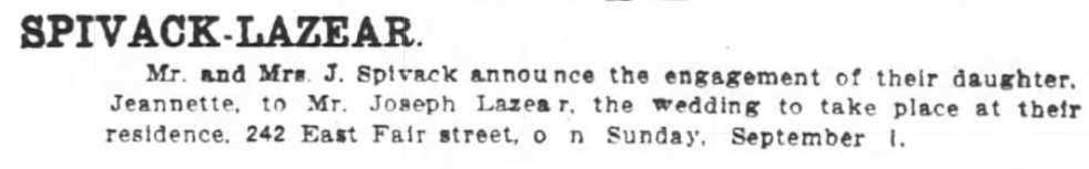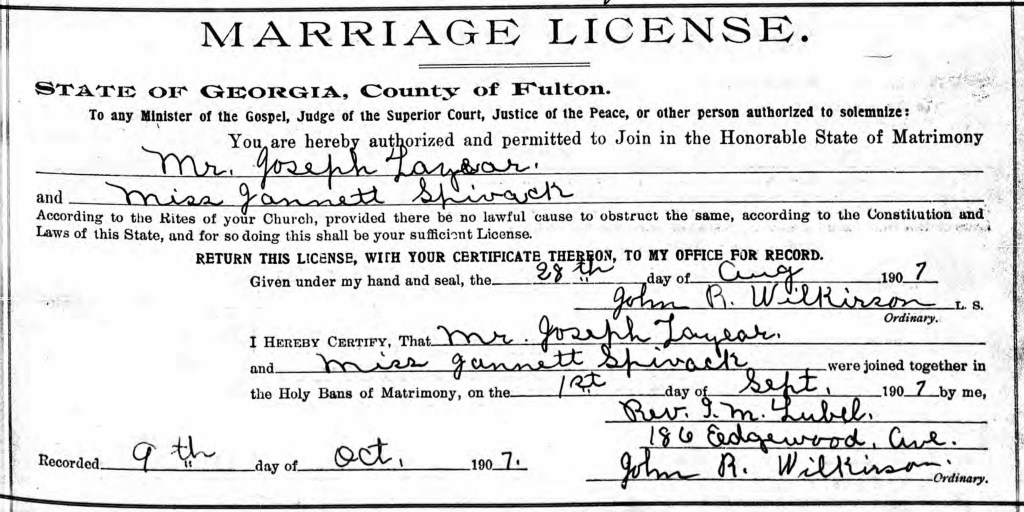 Joseph’s engagement to Jennie Spivack was announced on August 25, 1907, in the Atlanta Constitution. They married at the Spivack residence, 242 East Fair Street in Atlanta on September 1, 1907.10