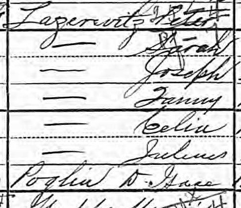 In 1900, Joseph,17 (born October 1882) lived with his parents, Peter, 36 (born December 1863) and Sarah, 33, (born June 1867) Lazarevitz (spelled Lazerevitz), and his siblings Fanny, 14 (born February 1886), Celia, 11 (born March 1889) and Julius, 9 (born October 1890) in a rented home at 138 Crawford Street, Pittsburgh, Pennsylvania. They also had a boarder, D. Isaac Poglin, 35 (born November 1864). Peter and Sarah had been married for 18 years, and four of their five children were still living. Peter, Sarah, and Joseph were born in Russia to Russian parents, having immigrated in 1886, 14 years prior. Isaac immigrated from Russia in 1880. Fanny, Celia, and Julius were born in Pennsylvania. Joseph and Isaac were naturalized. Peter and Isaac were insurance agents and Joseph, Fanny, and Celia had attended school 9 months the preceding year. Everyone but Julius could read, write, and speak English.2