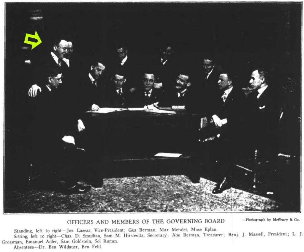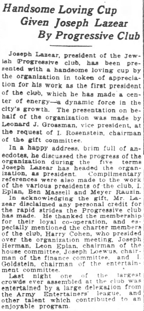 In a tribute to the three men who most influenced the Jewish Progressive Club, Joseph Lazear, Ike Eplan, and Benjamin J. Massel, the following was said about Joseph Lazear:
