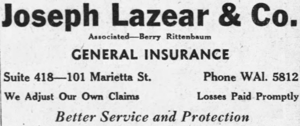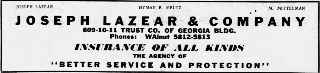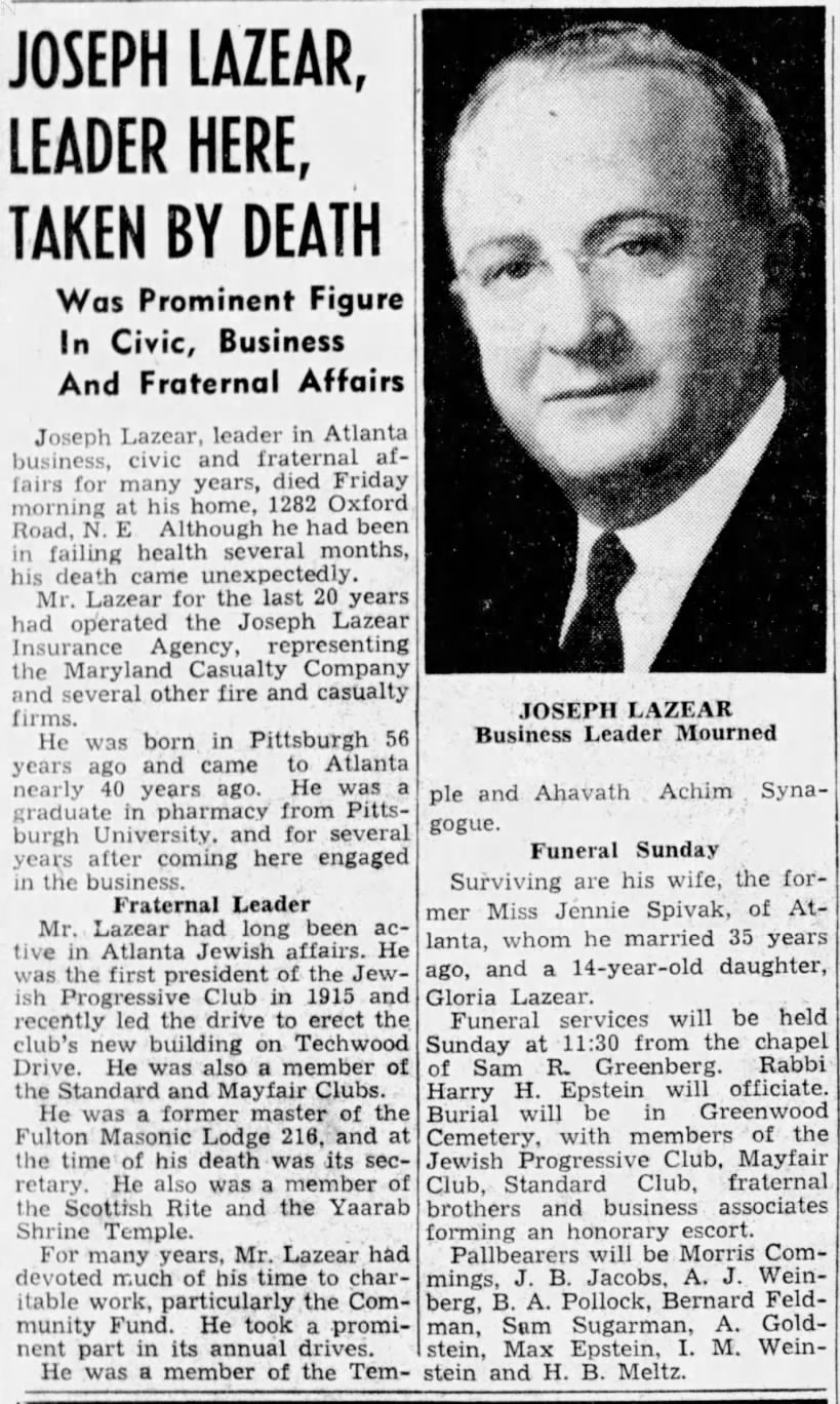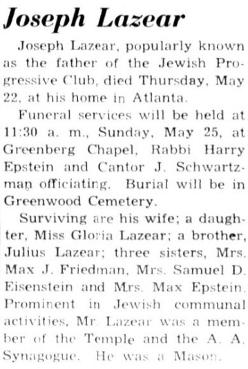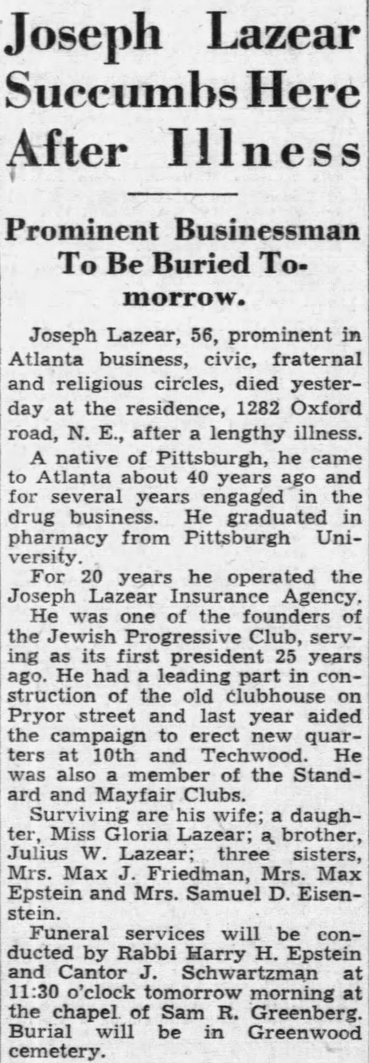 - “Joseph Lazear Succumbs Here After Illness,” The Atlanta Constitution, 24 May 1941, p. 15, col. 5, image, Newspapers.com (https://www.newspapers.com/article/the-atlanta-constitution/21077322/ : accessed 18 June 2018), clip page by user genistory; “Joseph Lazear, Leader Here, Taken By Death,” The Atlanta Journal, 23 May 1941, p. 20, cols. 1-2, image, Newspapers.com (https://www.newspapers.com/article/the-atlanta-constitution/148510914/ : accessed 1 June 2024), clip page by user genistory; “Atlanta Obituaries: Joseph Lazear,” The Southern Israelite, Augusta, GA, 23 May 1941, p. 8, col. 3, image, Georgia Historic Newspapers (https://gahistoricnewspapers.galileo.usg.edu/lccn/sn78003973/1941-05-23/ed-1/seq-8/print/image_563x817_from_863,839_to_3945,5310/ : accessed 4 May 2021). ↩︎