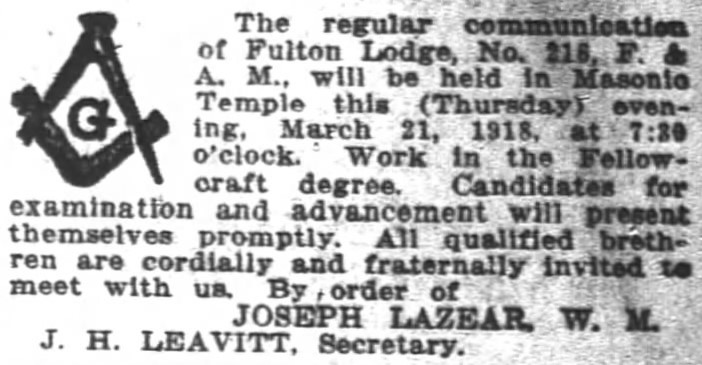 - December 19 – The Fulton Lodge Masons, No. 216, chose its officers for 1916, and Joseph advanced to junior warden.29
