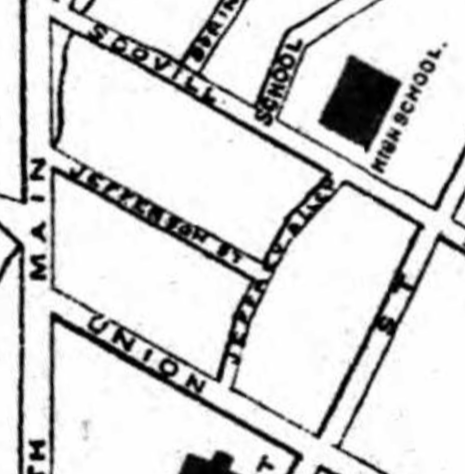 In 1874, Pearl Street continued north above Spring Street, but now the road makes a T-intersection, and new buildings cut off that part of the area.7