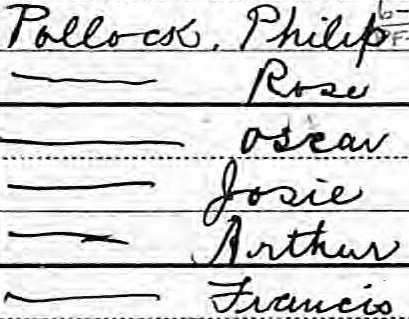 - 1900 U.S. Census, New Haven County, Connecticut, population schedule, Waterbury City, enumeration district (ED) 422, p. 291 (stamped), p. 12B (penned), dwelling 165, family 254, Philip Pollock, image, Ancestry (http://www.ancestry.com : accessed 18 August 2021), citing NARA microfilm publication T623, roll 147. ↩︎