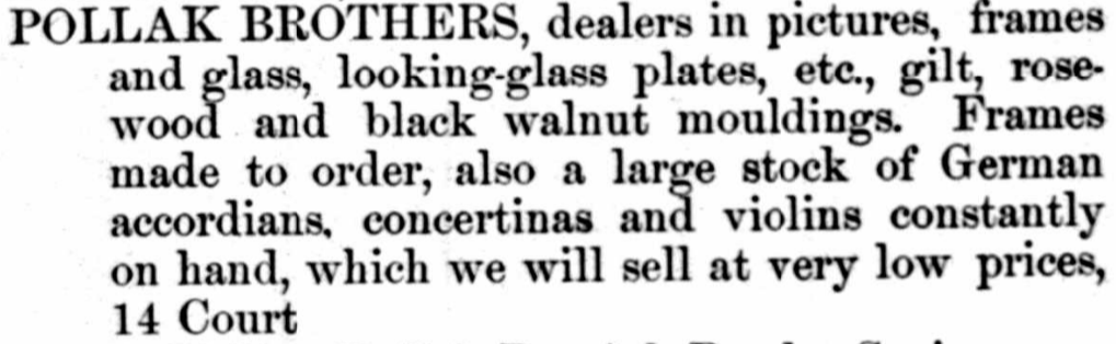 In 1871, Philip lived at 14 1/2 Court St. in Middletown, Connecticut, and worked for J. Barrett & Co., a company that sold picture frames.5 By 1872, Philip had established his own business, Pollak Brothers, at 14 Court St. in Middletown, while he lived on Pearl St., north of Spring St. Pollak Brothers sold pictures, frames made of rosewood and black walnut, glass, mirrors, German accordions, concertinas, and violins.6
