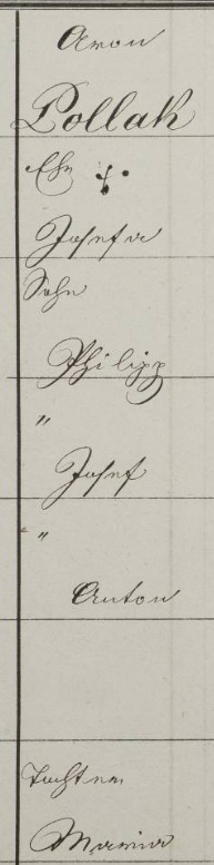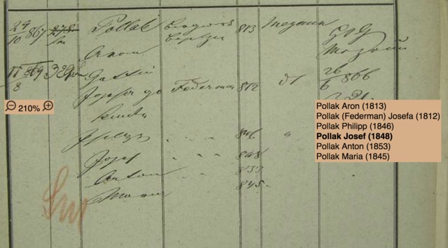 Philip’s family was recorded in the Population Register of Prague in 1864. Joseph lived with his parents, Aron (born 1813) and Josefa (Federman) Pollak (born 1812), along with his siblings Joseph (born 1848), Anton (born 1853), and Maria (born 1845). It is unclear whether Philip’s brother, Adolph, is listed in this record as Anton or if Anton is an additional brother. Most records for Adolph indicate his date of birth as April 1851 or 1852. The family resided in Mezouň, Bohemia, a small rural community about 23 kilometers southwest of Prague.1
