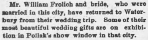 - “Local News: Brief Mentions,” The Morning Journal-Courier, New Haven, CT, 2 May 1884, unpaginated, 2nd page, col. 1, image, Newspapers.com (https://www.newspapers.com/article/-frolichs-wedding-gifts-in-pollaks-sho/26467413/ : accessed 24 May 2018), clip page by user genistory. ↩︎