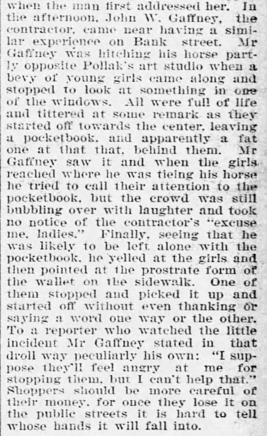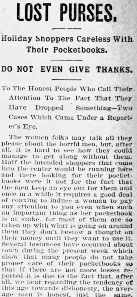 - “Lost Purses: Holiday Shoppers Careless With Their Pocketbooks,” The Waterbury Democrat, Waterbury, CT, 22 December 1900, p. 1, col. 7, image, Newspapers.com (https://www.newspapers.com/article/the-waterbury-democrat/57509196/ : accessed 17 August 2020), clip page by user genistory. ↩︎