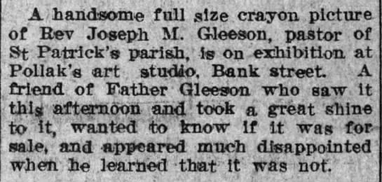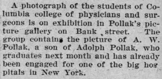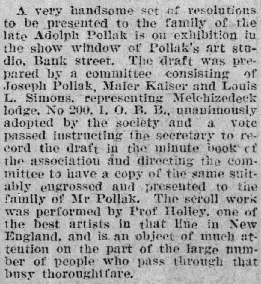 - “City News,” The Waterbury Democrat, Waterbury, CT, 10 May 1893, unpaginated, 4th page, col. 2, image, Library of Congress: Chronicling America (https://chroniclingamerica.loc.gov/lccn/sn94053256/1893-05-10/ed-1/seq-4/#date1=1777&index=14&rows=20&words=Philip+Pollak&searchType=basic&sequence=0&state=&date2=1963&proxtext=Philip+Pollak&y=0&x=0&dateFilterType=yearRange&page=1 : accessed 22 January 2022). ↩︎
