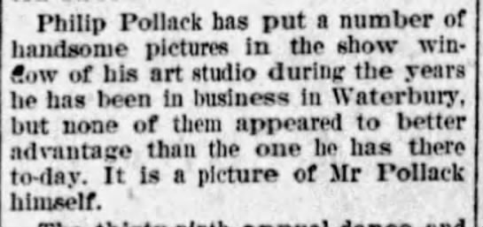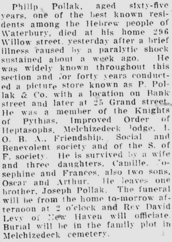Transcript: "Philip Pollak, aged sixty-five years, one of the best known residents among the Hebrew people of Waterbury, died at his home, 296 Willow street, yesterday after a brief illness caused by a paralytic shock sustained about a week ago. He was widely known throughout this section and for forty years conducted a picture store known as P. Pollak & Co. with a location on Bank street and later at 25 Grand street. He was a member of the Knights of Pythas, Improved Order of Heptasophs, Melchizedeck lodge, I.O.B.A., Friendship, Social and Benevolent society and of the S. of F. society. He is survived by a wife and three daughters, Camille, Josephine and Frances, also two sons, Oscar and Arthur. He leaves one brother, Joseph Pollak. The funeral will be from the home to-morrow afternoon at 2 o'clock and Rev. David Levi of New Haven will officiate. Burial will be in the family plot in Melchizedeck cemetery."