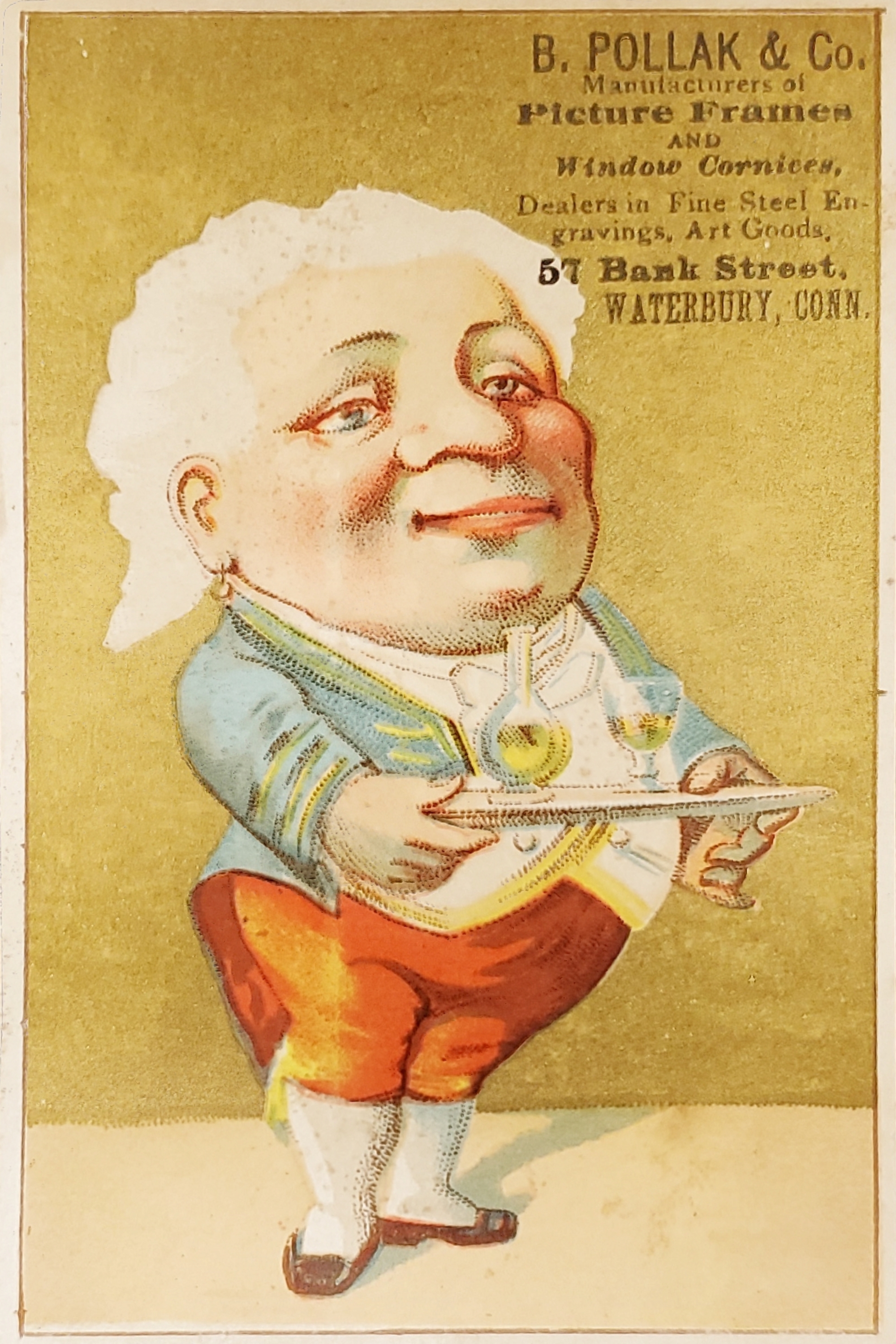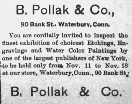 From 1886 to 1888, the B. Pollak & Co. was located at 56 Bank Street, Waterbury, Connecticut.22