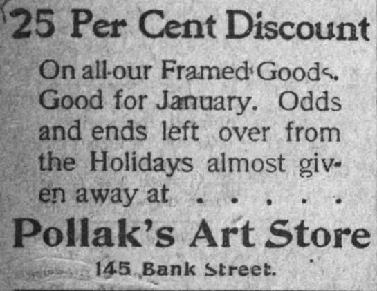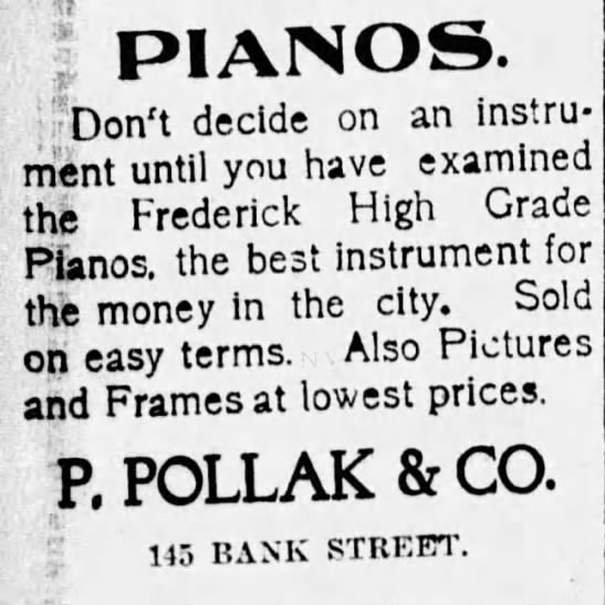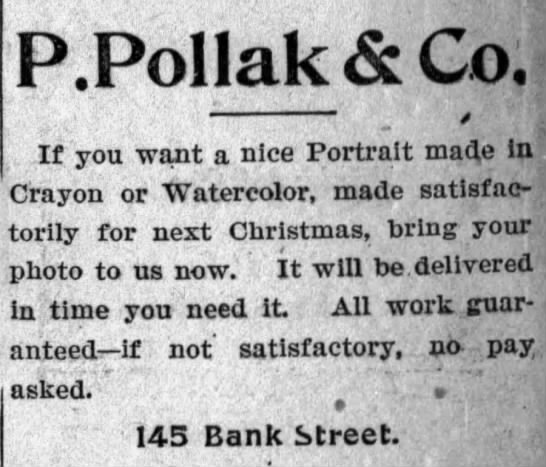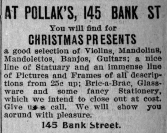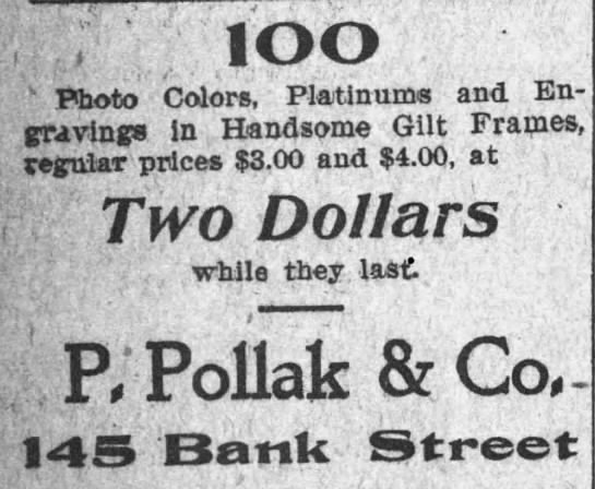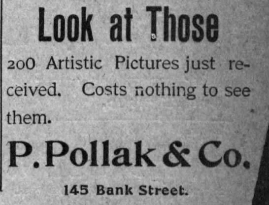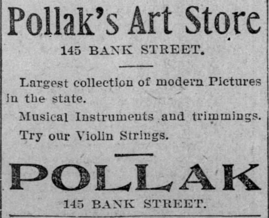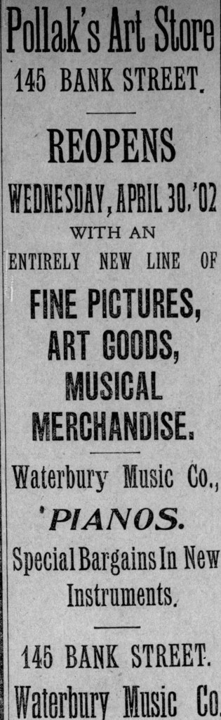 After reopening in April 1902, the Pollak Brothers—also known as Pollak’s Art Store or P. Pollak & Co.—began advertising regularly in the Waterbury Democrat. They continued this advertising campaign until around 1905.49