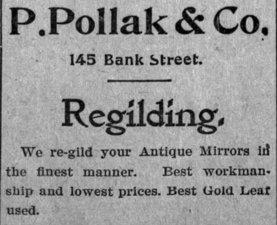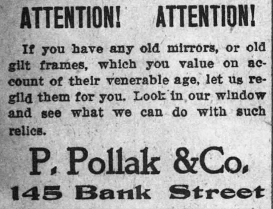 This year, the shop was listed as “Pollak B.,” which could be short for “Pollak Brothers.” However, there is a home address listed as 11 High Street, which is where Philip’s brother, Adolph, lived. This could be the time that Adolph’s wife, Bertha, became involved with the business. The shop had moved locations as well, to 57 Bank Street, where it remained until 1883.