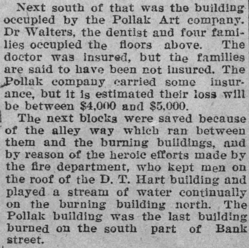 According to reports, the Pollak Art Company was located at the edge of the fire at 145 Bank Street, Waterbury, Connecticut. The Pollak Brothers occupied the first floor, while a dentist’s office and four families lived above. The families did not have insurance, although the dentist was fully insured and the Pollak Brothers had partial coverage. Despite this, their out-of-pocket losses amounted to $4,000-5,000—a significant sum at the time.46 An article printed on February 5, 1902, mentioned that some businesses were still smoldering, including the Pollak building, which sustained partial damage. A small fire remained at 9 pm but was easily extinguished.47