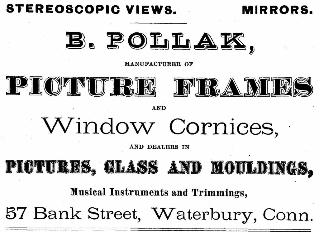 In 1875, Philip lived with his brother, Adolf, at 14 Chatfield Avenue, Waterbury, Connecticut. They, along with Joseph, sold picture frames at their business, Pollak Brothers, at 122 South Main Street, also in Waterbury.8 Chatfield Avenue was once located near Bank and Meadow Streets, but it vanished with the construction of Interstate 84.