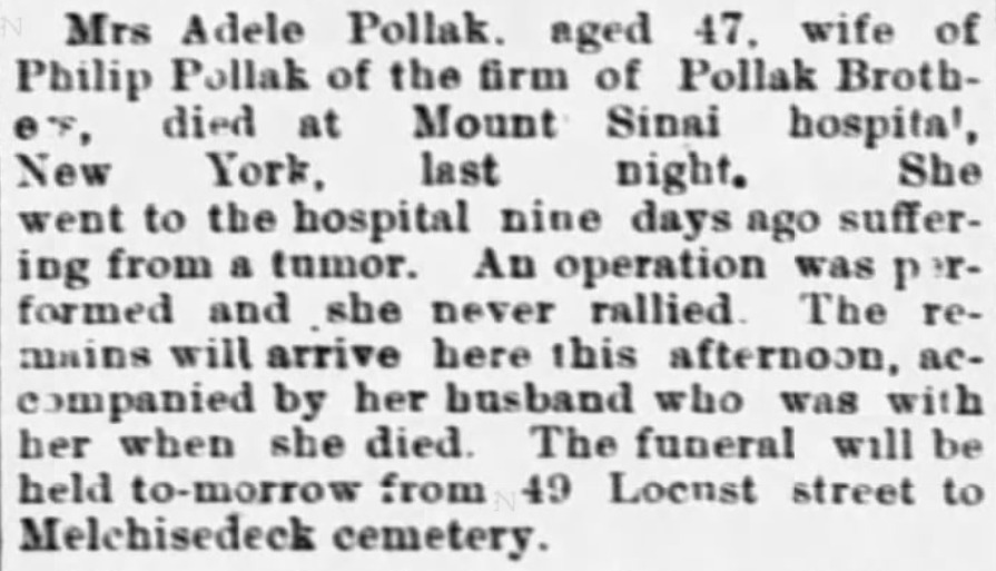 Transcript: "Mrs Adele Pollak, age 47, wife of Philip Pollak of the firm of Pollak Brothers, died at Mount Sinai hospital, New York, last night. She went to the hospital nine days ago suffering from a tumor. An operation was performed and she never rallied. The remains will arrive here this afternoon, accompanies by her husband who was with her when she died. The funeral will be held to-morrow from 49 Locust street to Melchisedeck cemetery."