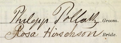 On April 12, 1896, 50-year-old Philip married 38-year-old Rose Hirschon. Philip, born in Bohemia to Aron Pollak and Josephine Federman, was a resident of Waterbury, Connecticut. Rose, born in Germany, lived in New York City. This was Philip’s second marriage, following the death of his first wife, while it was Rose’s first marriage.38